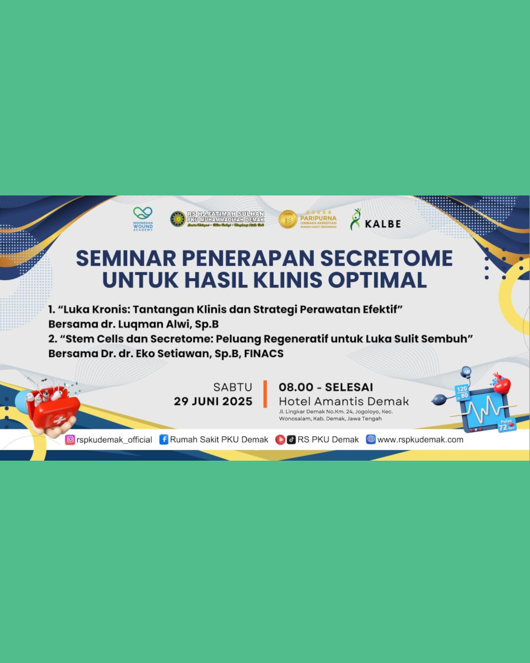 Mencetak Tenaga Medis Ahli dalamPerawatan LukaPelajari Lebih Lanjut Luka bukan akhir dari segalanya. Dengan pengetahuan dan teknologi yang tepat, penyembuhan bisa lebih cepat dan optimal.Company Name Events Workshop “Stem Cells for Wound Regeneration” 28 September 2025 Tidak ada komentar Baca Lebih Lanjut Seminar Penerapan Secretome untuk Hasil Klinis Optimal 9 Juli 2025 Tidak ada komentar Baca Lebih Lanjut Webinar Merawat Dengan Empati: Strategi Pada Luka Paliatif 9 Juli 2025 Tidak ada komentar Baca Lebih Lanjut Webinar Stem Cells for Wound Regeneration and Healthy Aging 9 Juli 2025 Tidak ada komentar Baca Lebih Lanjut SubscribeKami hadir untuk memberikan pelatihan komprehensif tentang perawatan luka, mekanisme penyembuhan, hingga pemanfaatan stem cell.Mari tingkatkan kualitas perawatan luka di Indonesia bersama kami!Pelajari Lebih Lanjut